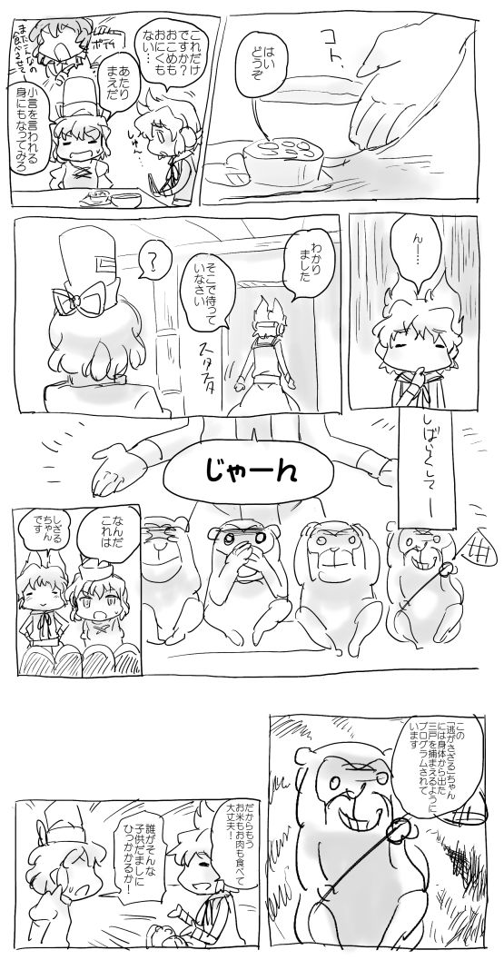 この漫画のプロットは口授が発売される前から考えてあって、後半の弁当のくだりが描きたかっただけなので前半の会話部分は適当に読み流せるもので埋めればいいかと思っていたのですが、せっかく神子と慧音の組み合わせなので文花帖で出てきた秘密結社について話し合ってもらいました。ここの話も一冊本にしたいところではあります(言うだけならタダですよね)神子には悪人正機説よろしく、欲や疑う心を捨てきれなかったりする本当の意味で弱くて救われるべき人間を受け入れるキャラクターであってほしいです。